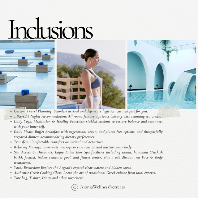 Nourishing meals crafted from fresh, local ingredients will support your journey, while your luxury accommodations provide breathtaking sea views and restful comfort. You’ll also enjoy moments of exploration and connection—whether hiking Amorgos’ scenic trails, swimming in crystal-clear coves, or immersing yourself in the island’s rich traditions.